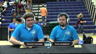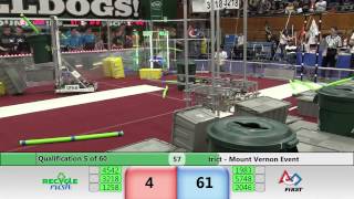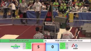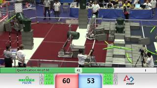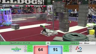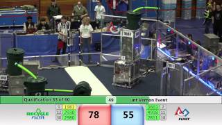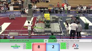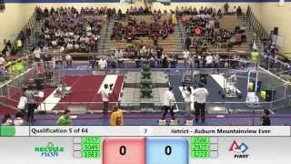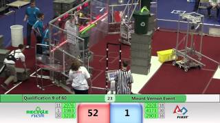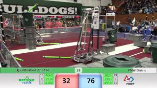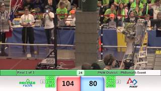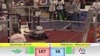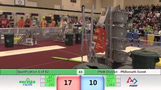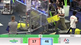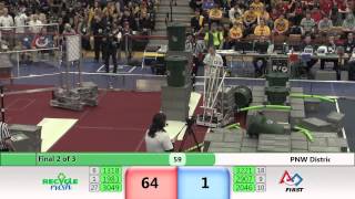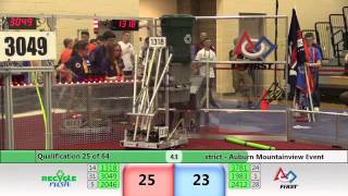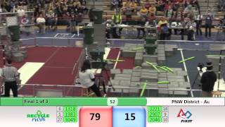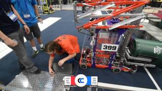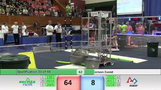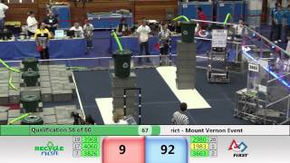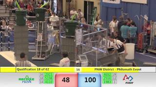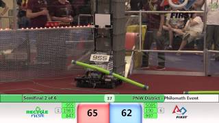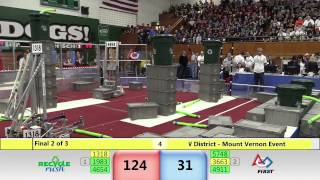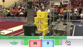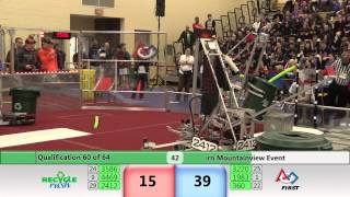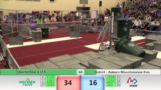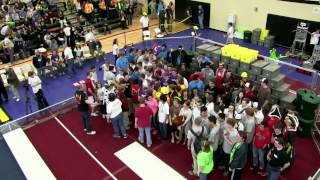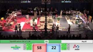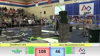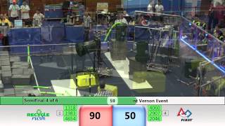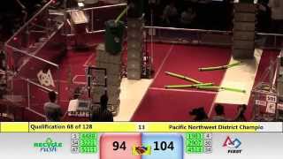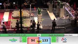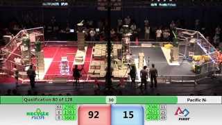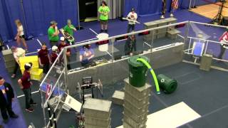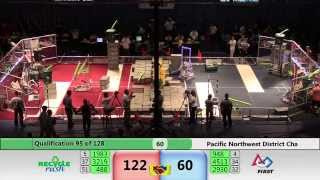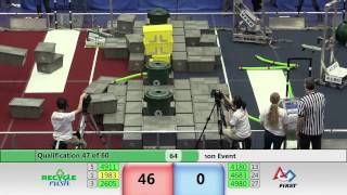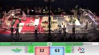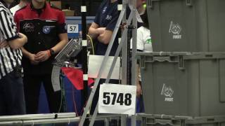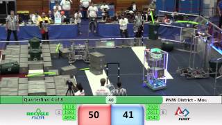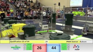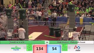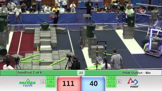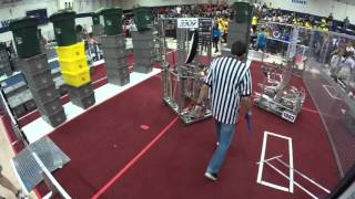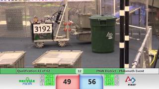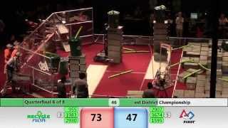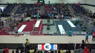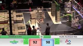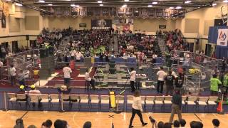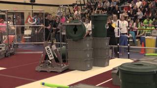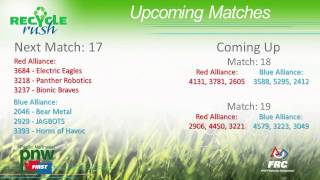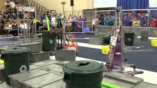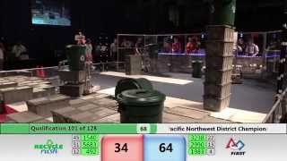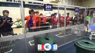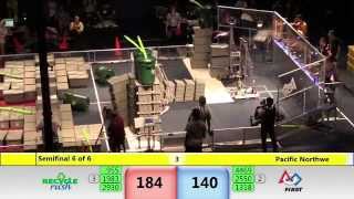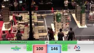 Recycle Rush is a completely different game for FRC. This game is played with little interaction between oposing alliances. The goal is to stack totes with a recycling container on top. Matches are still two-and-a-half minutes long, starting with a 15 second auto period followed by a 2:15 minute tele-operated period. In middle of the field, four special yellow totes can be stacked to form a "Coopertition Stack" with bonus points. The event ranking system is different, too. This year, there are no winners of matches, and the seed rank is based on average points scored. The elimination bracket is now called "Playoffs" where the highest ranking alliances advance through quarterfinals, semifinals, and onto finals, where the winner is finally determined.