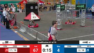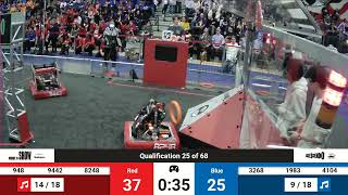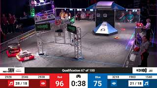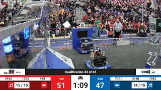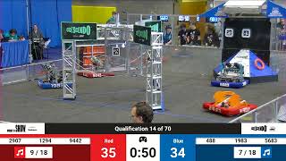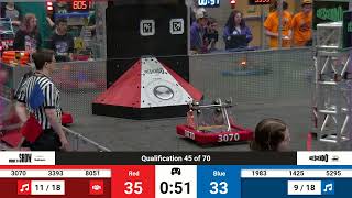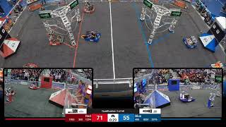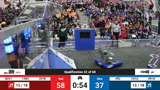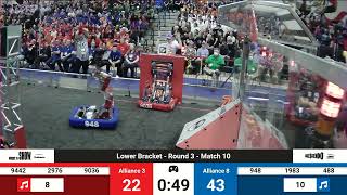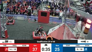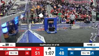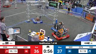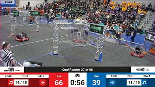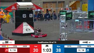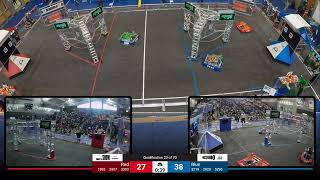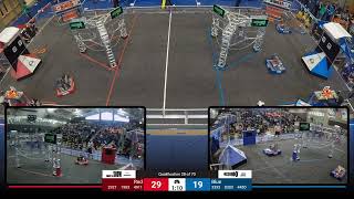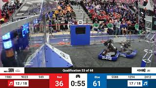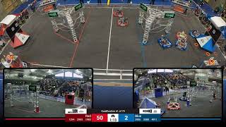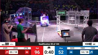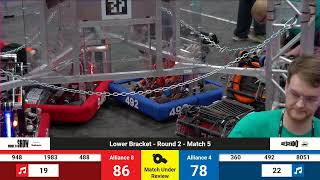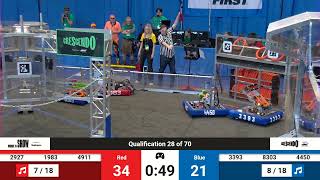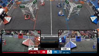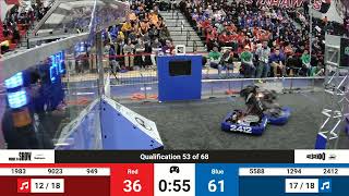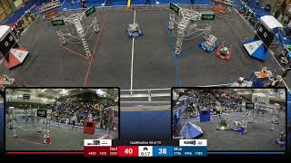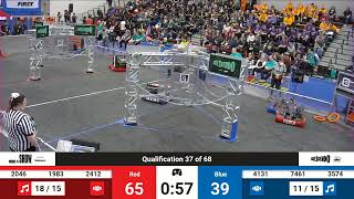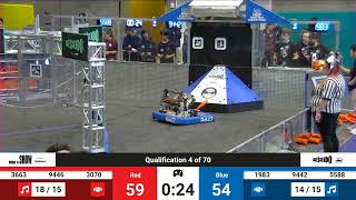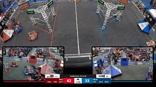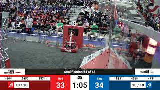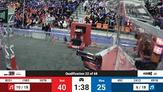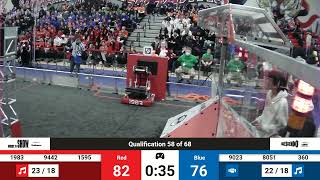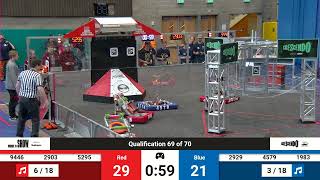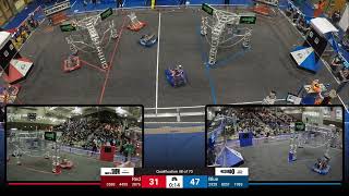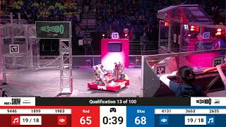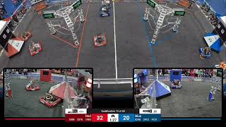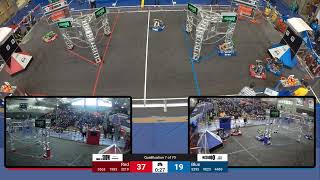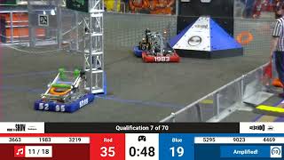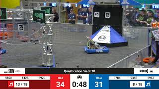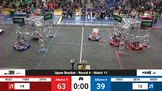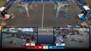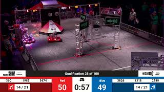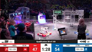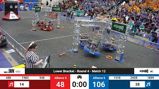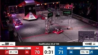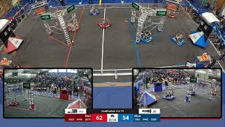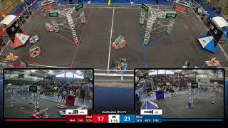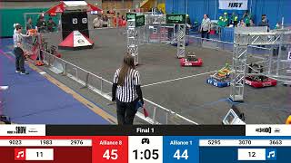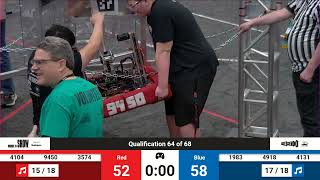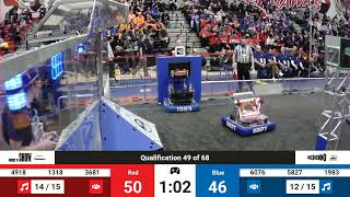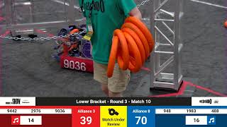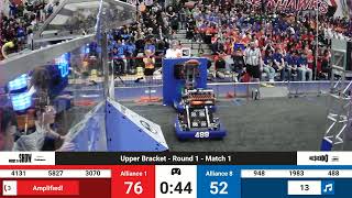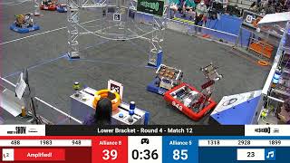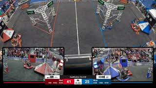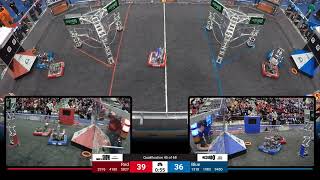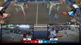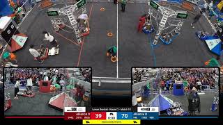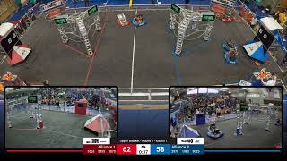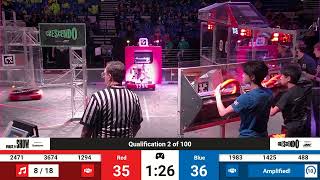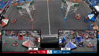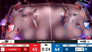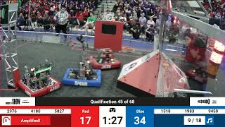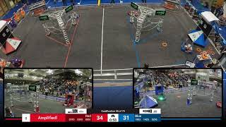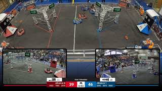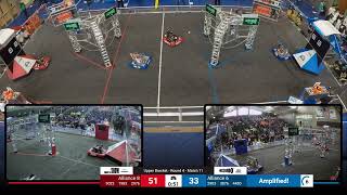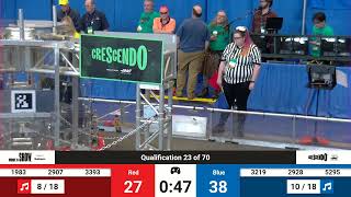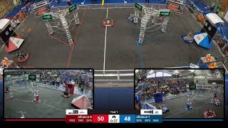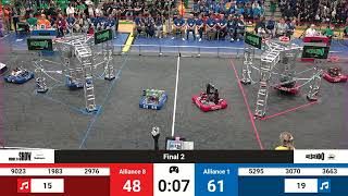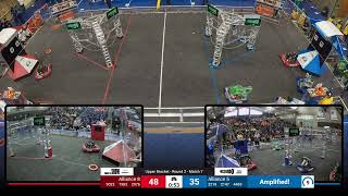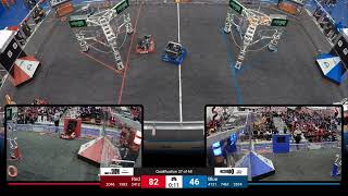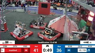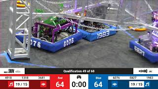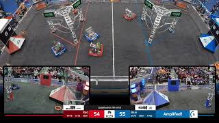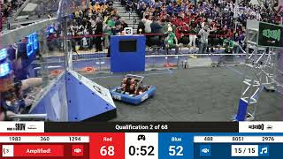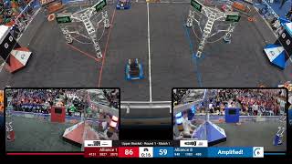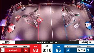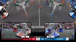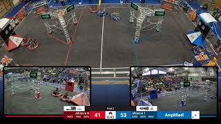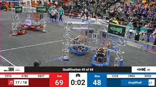 Crescendo, featured a music and concert theme. In this game, two alliances, each consisting of three teams, competed to score points by manipulating game pieces called "Notes"—orange foam rings. Teams aimed to score Notes into their alliance's "Speakers" and "Amps" located on the field. Successfully scoring Notes in the Amp allowed human players to activate a 10-second amplification period, during which Notes scored in the Speaker were worth additional points. During the endgame phase, robots attempted to climb onto structures known as "Stages" using metal chains, earning extra points. Additional bonuses were awarded for coordinated climbs, known as "Harmonizing," and for human players successfully tossing High Notes onto specific field elements, thereby "Spotlighting" robots for extra points.